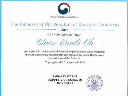 These performances include story telling pieces such as, "Cinderella", "Snow White and the seven dwarfs", "Two Brothers and the Magic Gourd" and other special events such as TaeKwonDo tournament and cultural events. I have had the opportunity to perform in Ohio, Purdue University, St. Louis and New York. And in August of 2022, I have had the honor to perform in Honduras for the Korea-Honduras 60th Anniversary of Diplomatic Relations, sponsored by the Republic of Korea.
